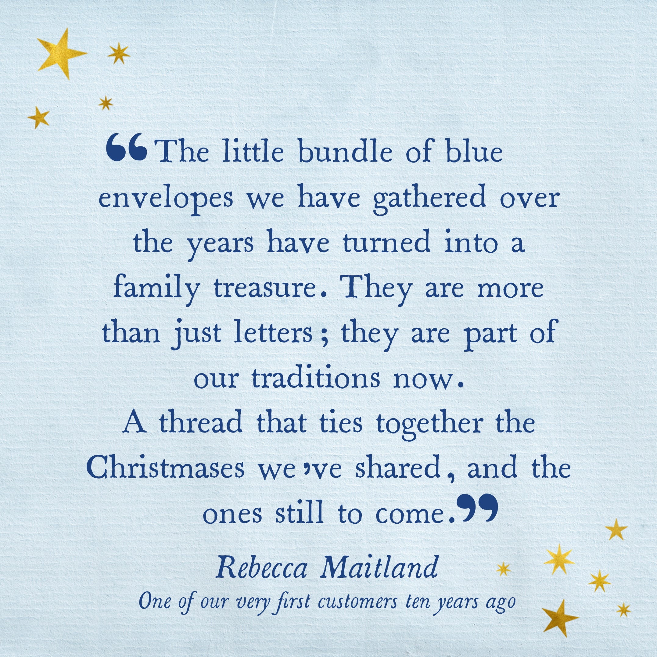 It all started ten years ago... for the past decade Father Christmas has entrusted us with his replies to children's letters around the world - a feat achieved through equal parts ink, Believe Bars, and certified Christmas magic. We are both astonished and delighted to have reached this milestone and wish to extend our sincere thanks to all who have written, received, and believed along the way.