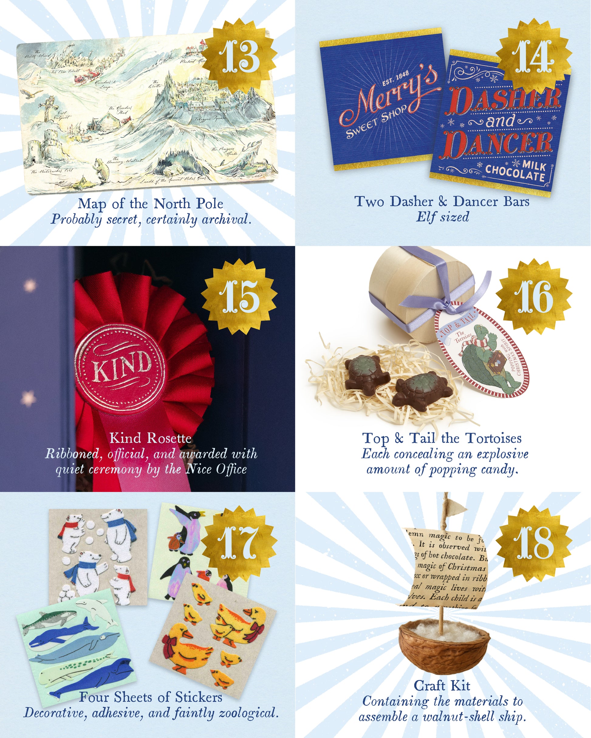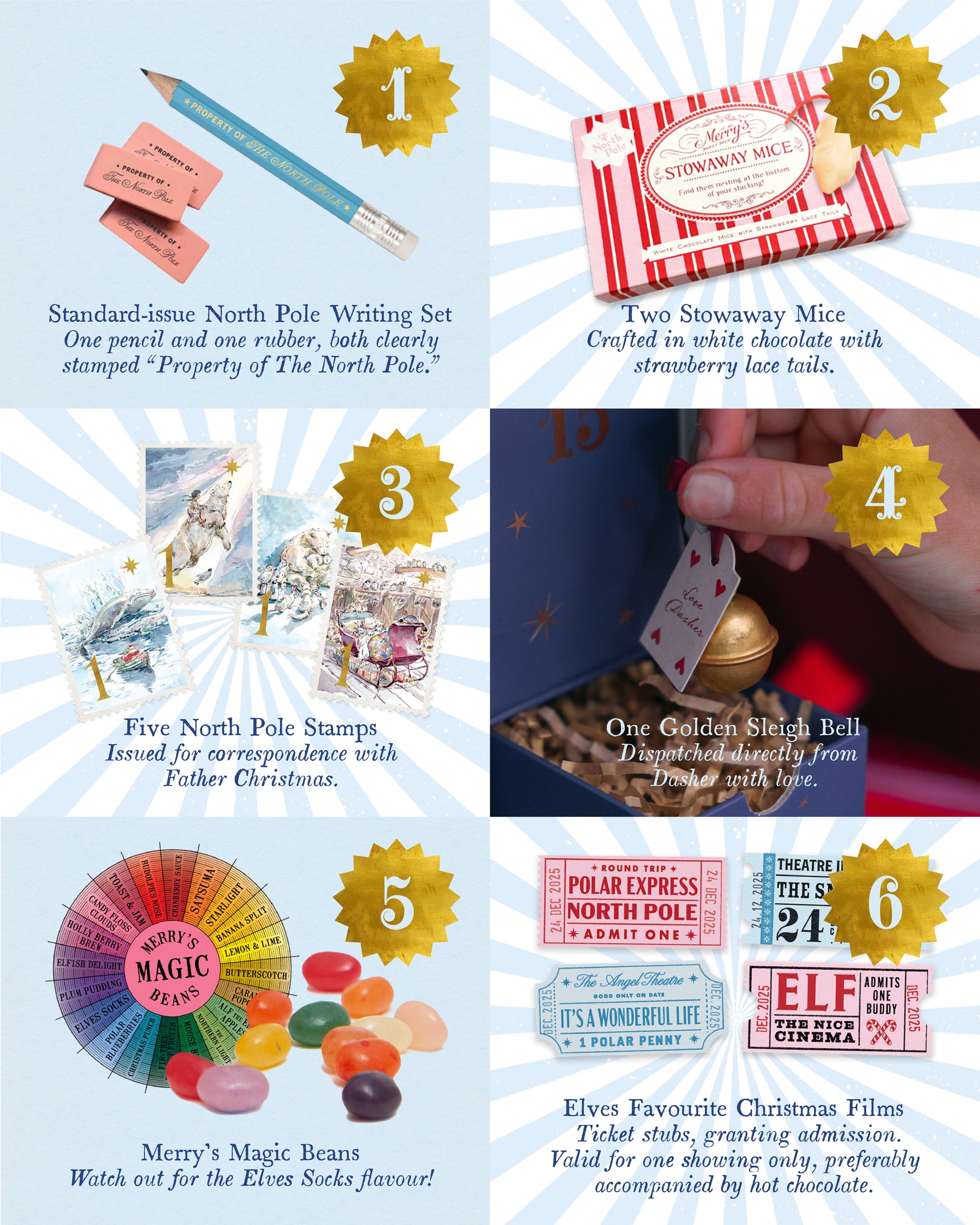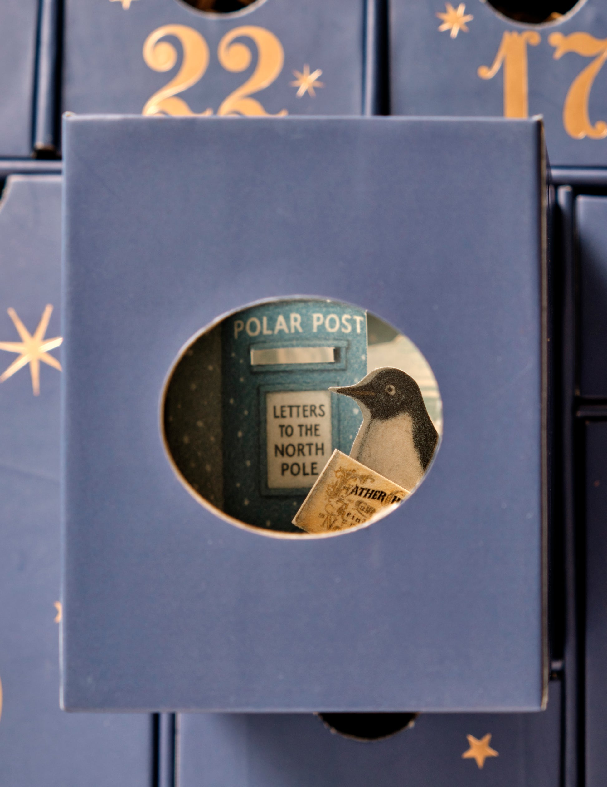 This Christmas Polar Post presents an advent calendar unlike any other. An assortment of twenty-four drawers, each precisely numbered, each containing a treasure from the North Pole. Together, they form a meticulous inventory of the season - correspondence kits from the North Pole, official certificates of kindness, zoological curiosities, and the occasional chocolate stowaway. The contents are equal parts official and magical, as though devised by a committee of owls, penguins, and elves working late into the Arctic night. To open a drawer is to enter a miniature scene - part storybook, part archive - unfolding gradually, one day at a time, until Christmas itself arrives.